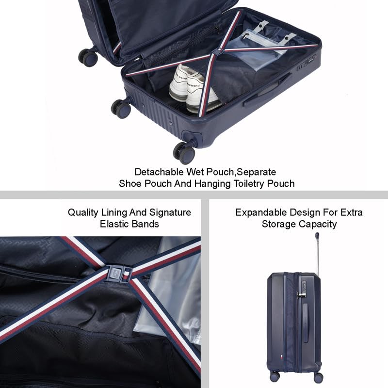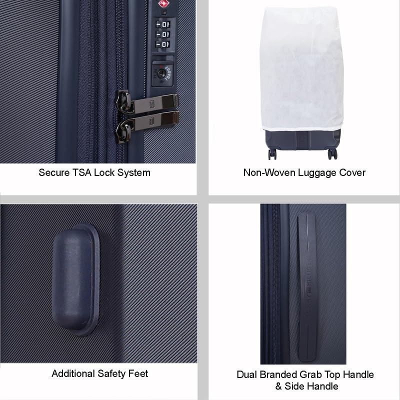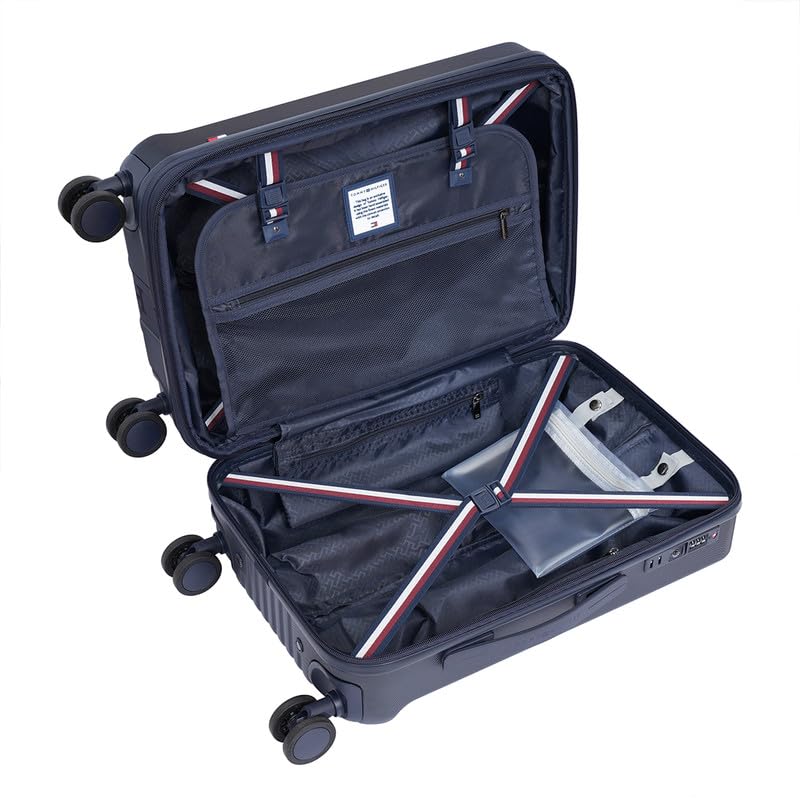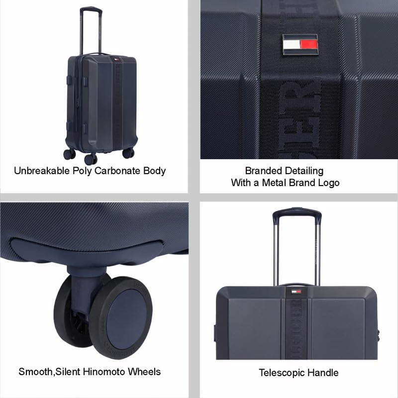 - PREMIUM DESIGN & ROBUST CONSTRUCTION: Discover the stylish Tommy Hilfiger Arbor Cabin luggage in a sophisticated Navy. Crafted from durable, lightweight, and water-resistant Polycarbonate (PC) material for unbreakable strength. Features branded detailing with a metal logo and distinctive "HILFIGER" branding on a front strap, along with a "TH" debossed logo on the back. Ideal for Gifting & Travel.