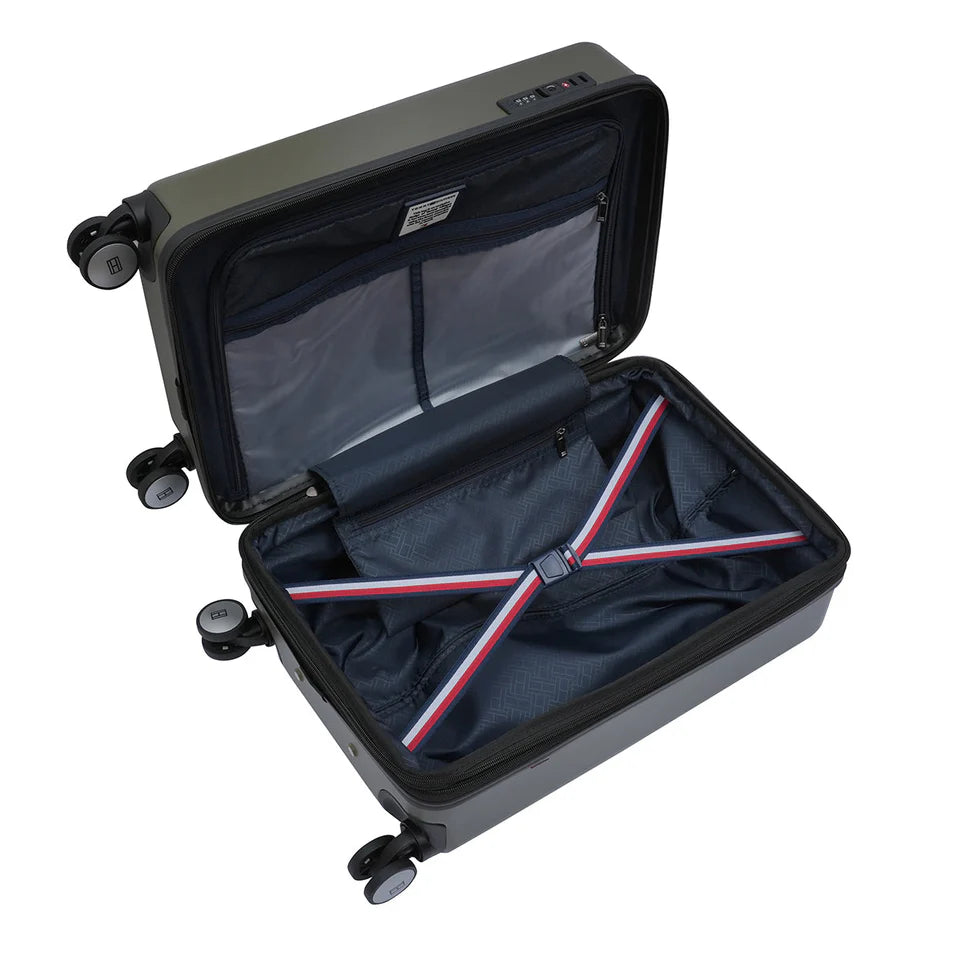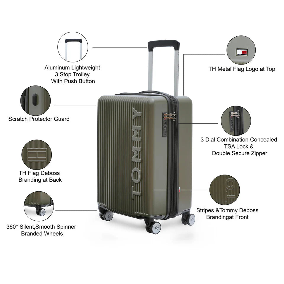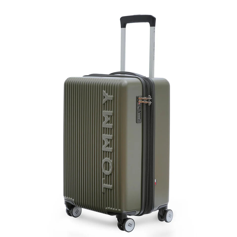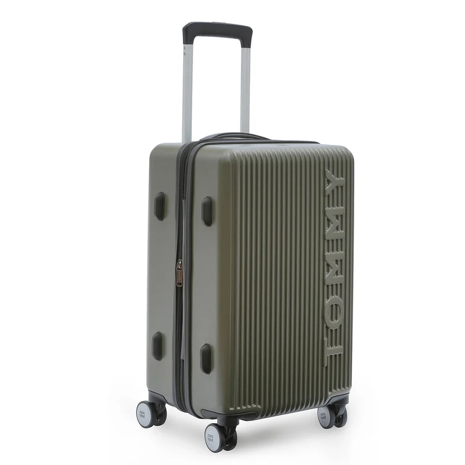 - ICONIC DESIGN & ROBUST CONSTRUCTION: Discover the distinct Tommy Hilfiger EMPIRE X Cabin trolley, a true statement of fashion-forward travel style. Crafted from a durable Polycarbonate shell in a sophisticated Olive color with signature vertical debossed lines. The prominent "TOMMY" branding is debossed on the front, adding a premium, recognizable touch, making it an ideal gift for the discerning traveler.
