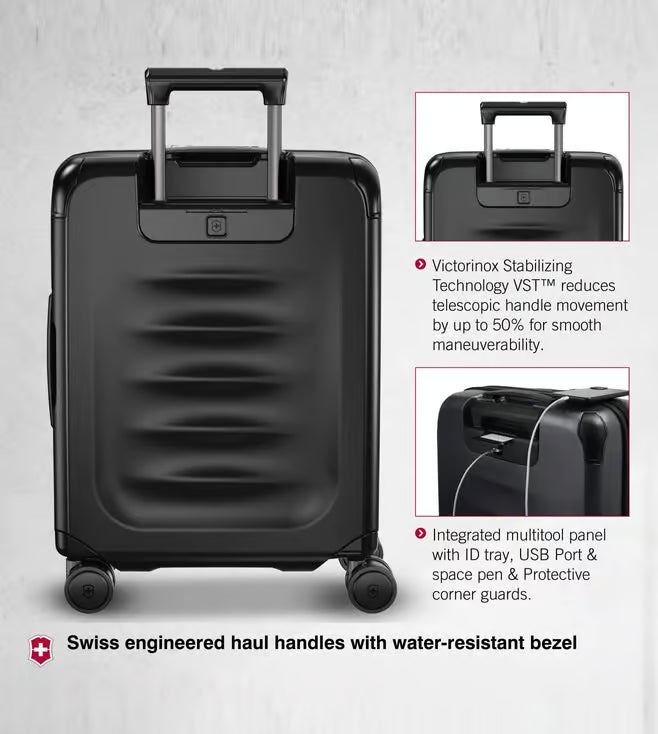 - VERSATILITY FOR EFFORTLESS TRAVEL: Innovative packing has compression straps, secure front-opening laptop compartment. 4 slot TSA Approved lock for independent locking. A removable divider, mesh pockets store items. The exclusive VST update reduces telescopic handle movement by up to 50% for a stable, smooth manoeuvrability. A water-resistant seal on the bezel prevents water from infiltrating the case. Integrated multitool panel with ID tray, USB Port & space pen. An option for personalization.